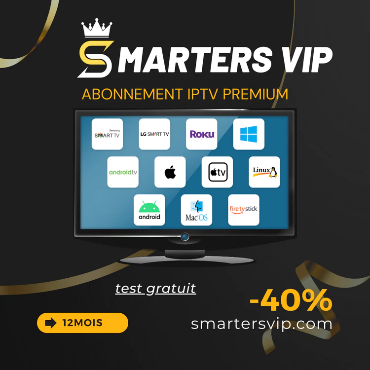 Nous vous proposons notre IPTV Premium Smarters VIP, qui vous permet de bénéficier d'un bouquet illimité de chaînes nationales et internationales couvrant presque tous les pays avec des qualités de diffusion très améliorées et une facilité d'accès.